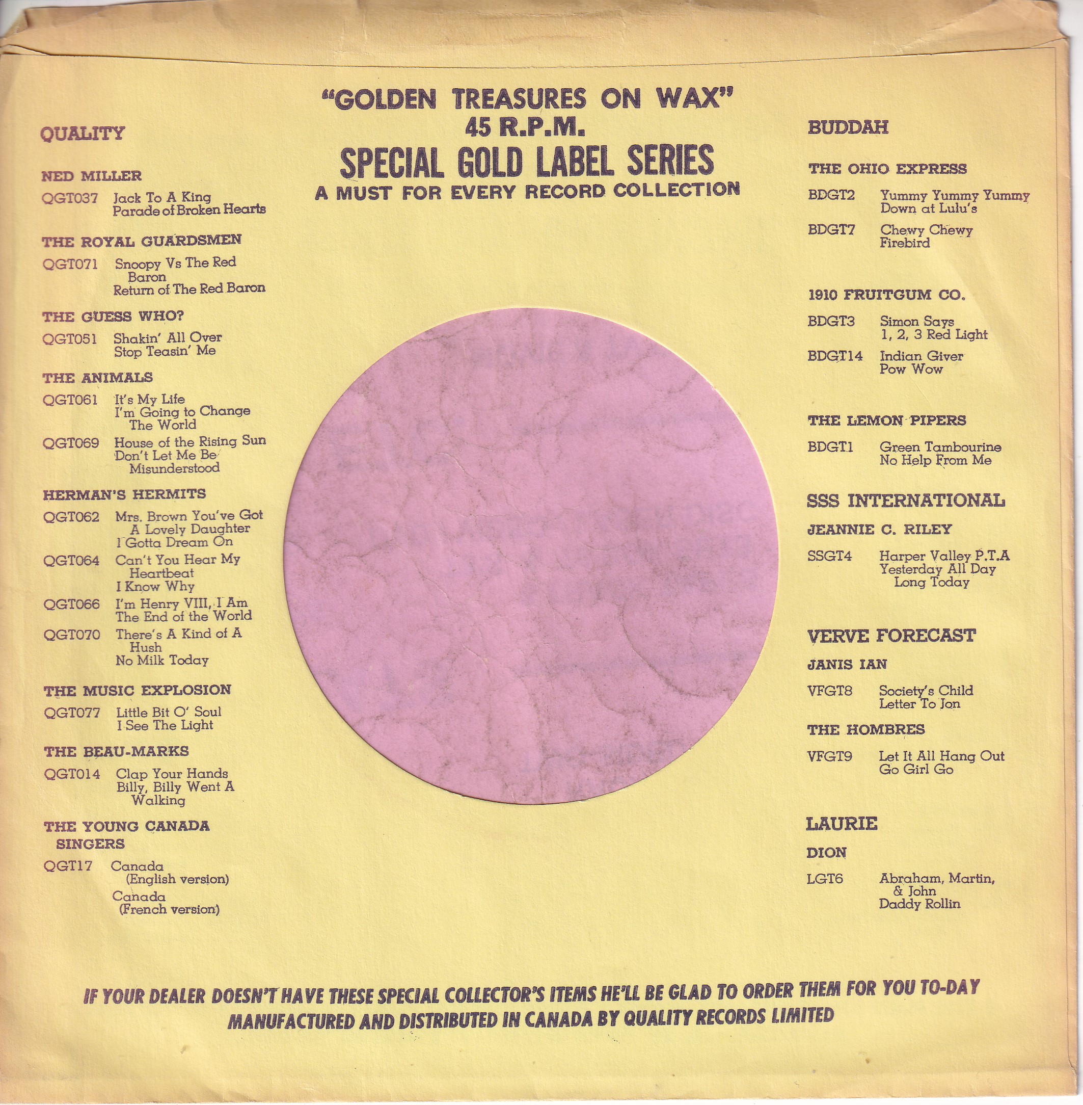 An original Canadian Record Company sleeve . In used good condition . May have some writting on or small tears , however , will be useable for your collection.